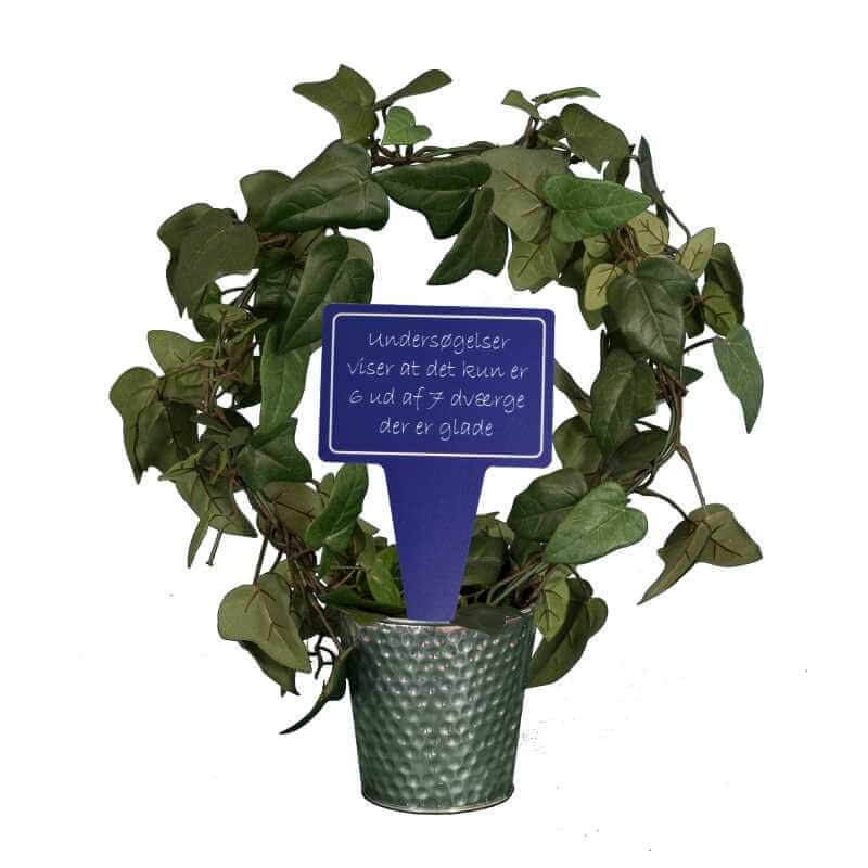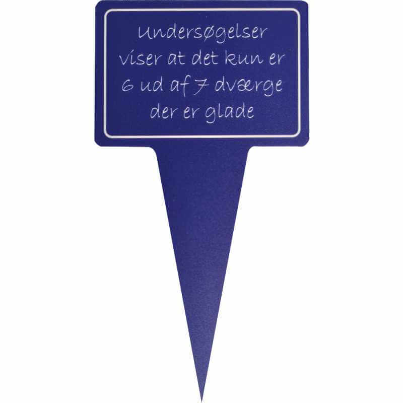 Sjovt planteskilt med teksten “Undersøgelser viser at det kun er 6 ud af 7 dværge der er glade”.