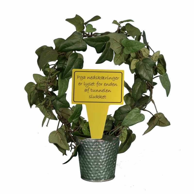 Sjovt planteskilt med teksten “Pga nedskæringer er lyset for enden af tunnelen slukket”.