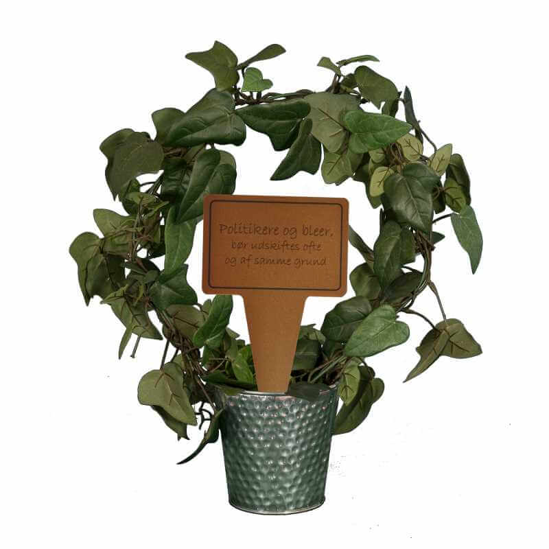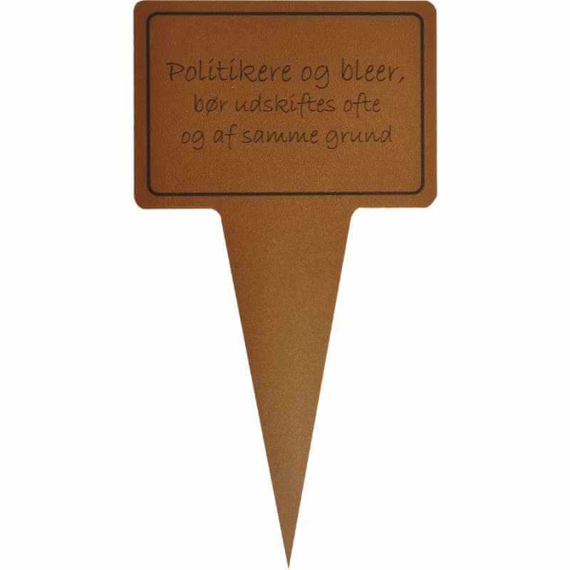 Sjovt planteskilt med teksten “Politikere og bleer, bør udskiftes ofte og af samme grund”