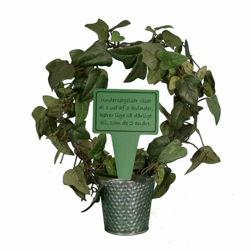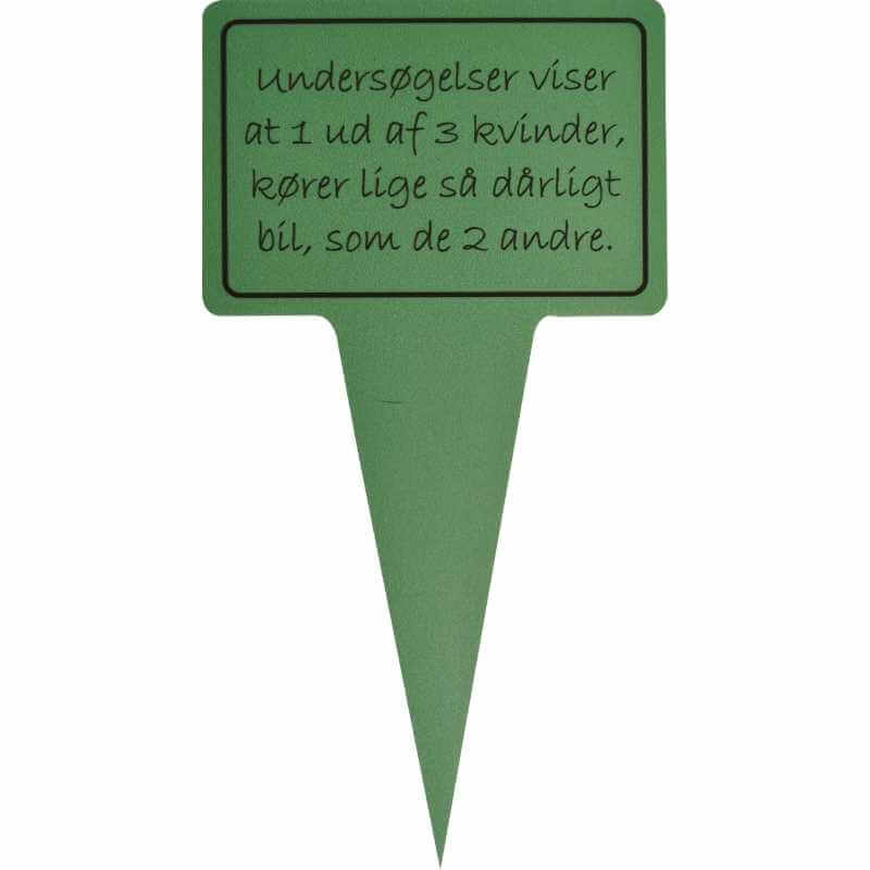 Sjovt planteskilt med teksten “Undersøgelser viser at 1 ud af 3 kvinder, kører lige så dårligt bil, som de 2 andre”.