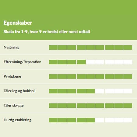 Det betyder at sorterne af græs, som findes i denne skygge græs fra Turfline, er officielt afprøvet igennem 3 år af NaturErhvervstyrelsen. Her tester de den blandt andet for slidstyrke, sygdomsresistens, tørketolerance og skudtæthed.