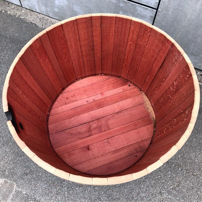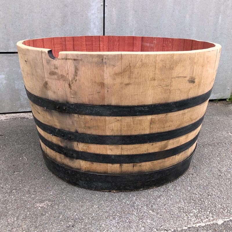 Her får du vores største halve vintønde, som er lavet i egetræ og kan rumme ca. 250 liter. (Det er vores 500 liters tønde som er skåret over på midten)