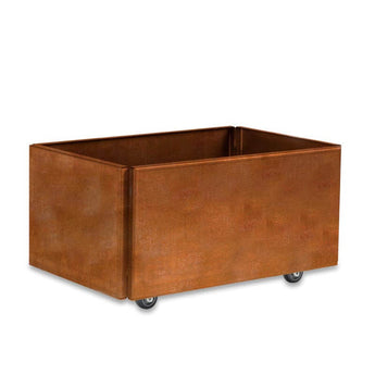Her får du en komplet plantekasse med hjul lavet i råjern i et smukt design, som får et rustikt og rustent udseende.