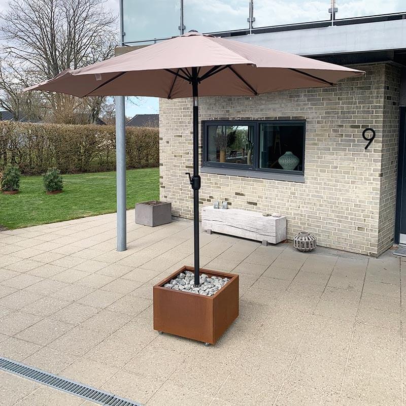 Her får du en utrolig flot og praktisk løsning, der fungerer både som en parasolfod og plantekasse.