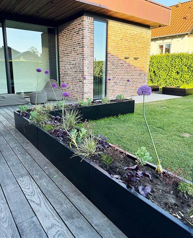 Her får du en helt unik højbeds- og afskærmningsløsning, som er dansk produceret og udført i smukt pulverlakeret sort stål.