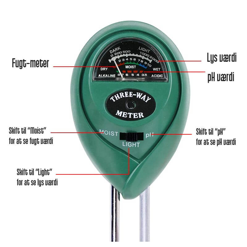 Den kan måle fugtighedsniveauet i jorden, ved at sætte måleren til ”Moist”. Her får du en ide om hvor fugtig jorden er ved dine planter og hvorvidt de mangler vand.