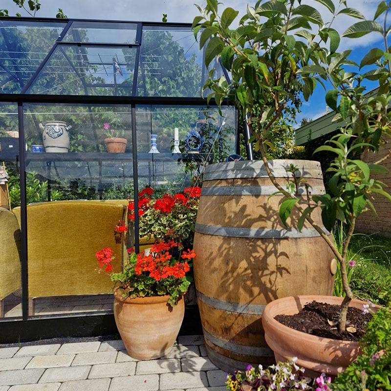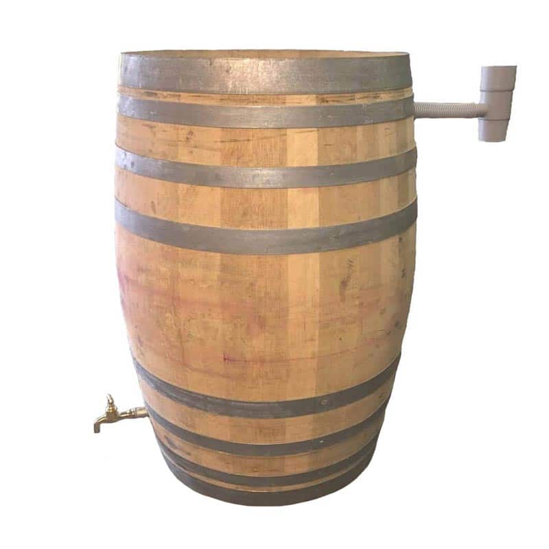 Her på siden ser du vores bud på en regnvandsindsamler. Vores regnvandstønder er lavet af brugte vintønder, som oprindeligt er blevet brugt som vinfad på et spansk vinslot. Regnvandstønden kan rumme 225 liter regnvand, og lader automatisk vandet i nedløbsrøret løbe videre, når tønden er fuld.