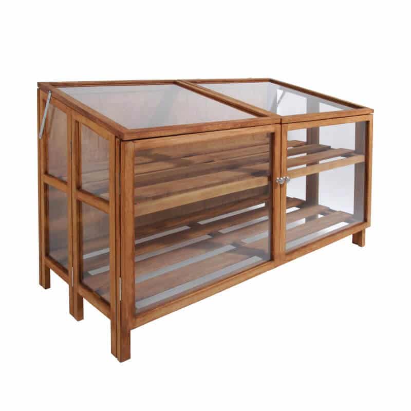 Flot og praktisk minidrivhus udført i hårdt træ, rustfrit stål og glas.