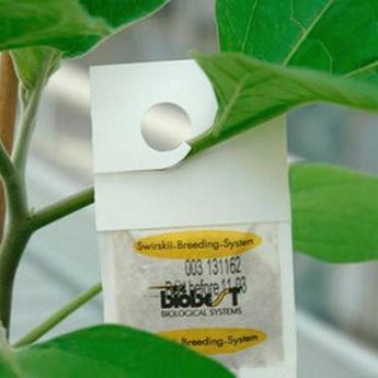 2. Småposerne hænges op på sidegrene eller bladstilke og i løbet af de følgende 4-6 uger vil der dagligt kravle tripsrovmider ud af posen og over på planten.