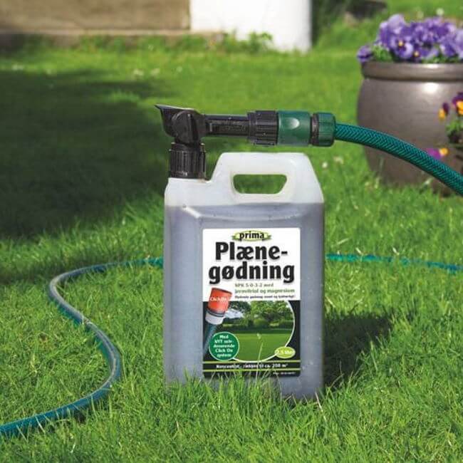 Påsæt din haveslange direkte til Click On systemet, som sidder på toppen af dunken og luk helt op for vandet. Herefter doserer Click On systemet selv den rette mængde plænegødning til vandet.