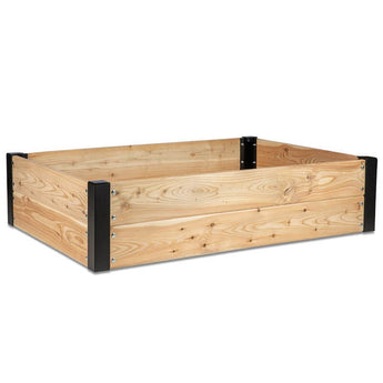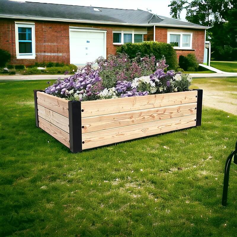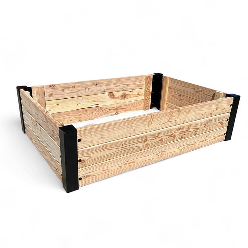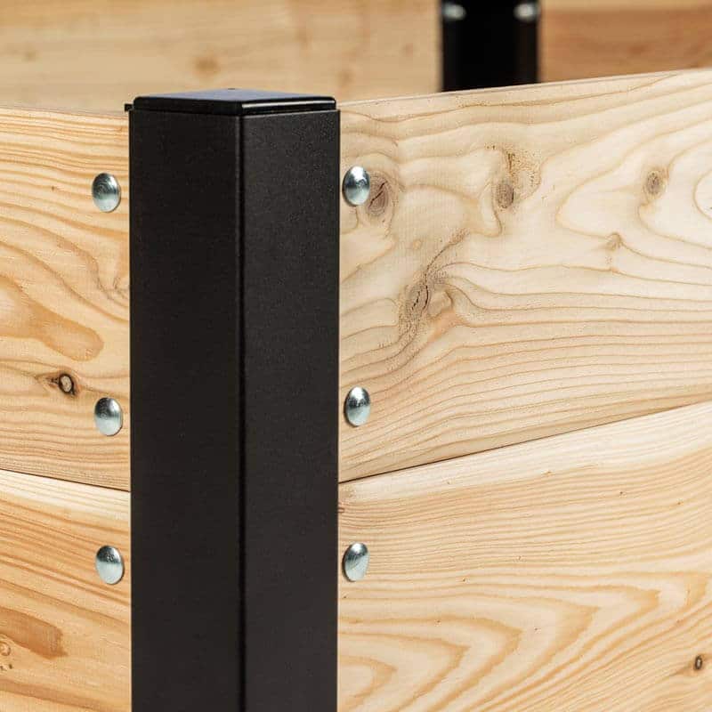 Her får du et utrolig flot højbed udført i stærkt og vejrbestandigt lærketræ. Hjørnerne er lavet i stærkt pulverlakeret jern.