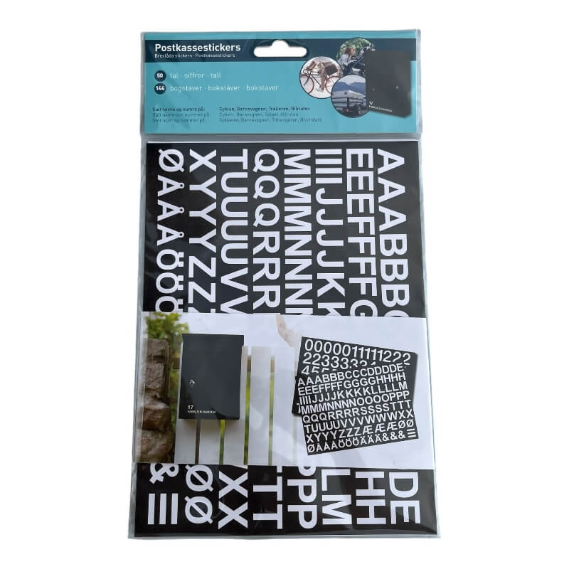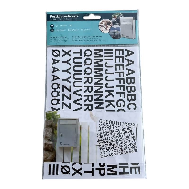Vælg mellem et folieark i enten sort eller hvid med selvklæbende bogstaver og tal.