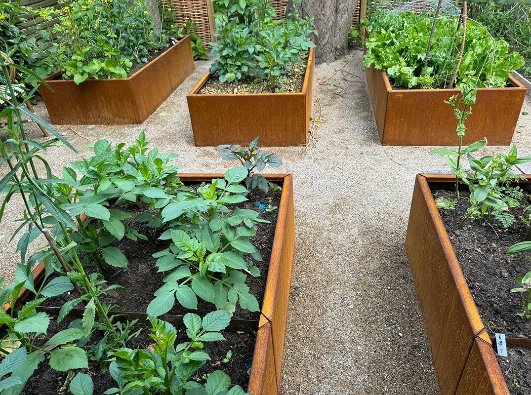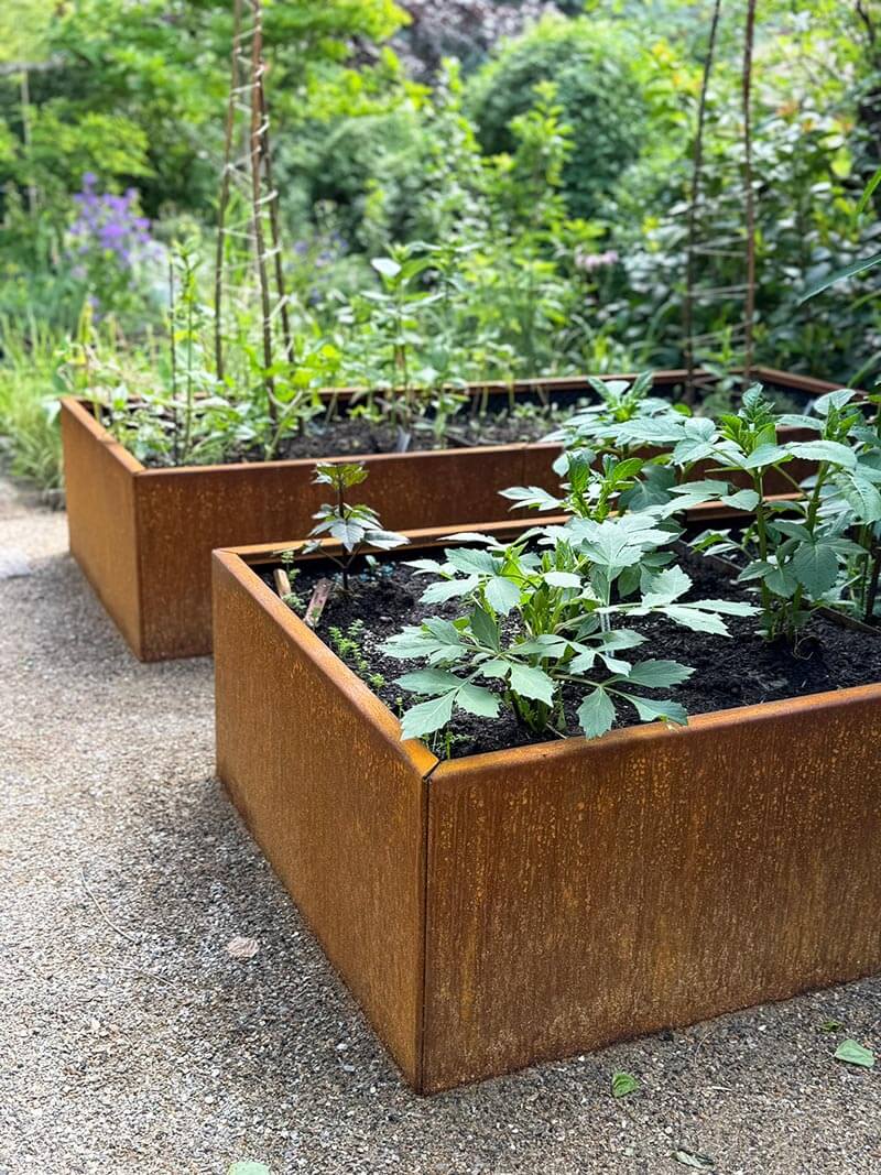 Vælg f.eks. et mindre cortenståls højbed til krydderurterne og et større højbed til grøntsagerne med lidt mere gods i.